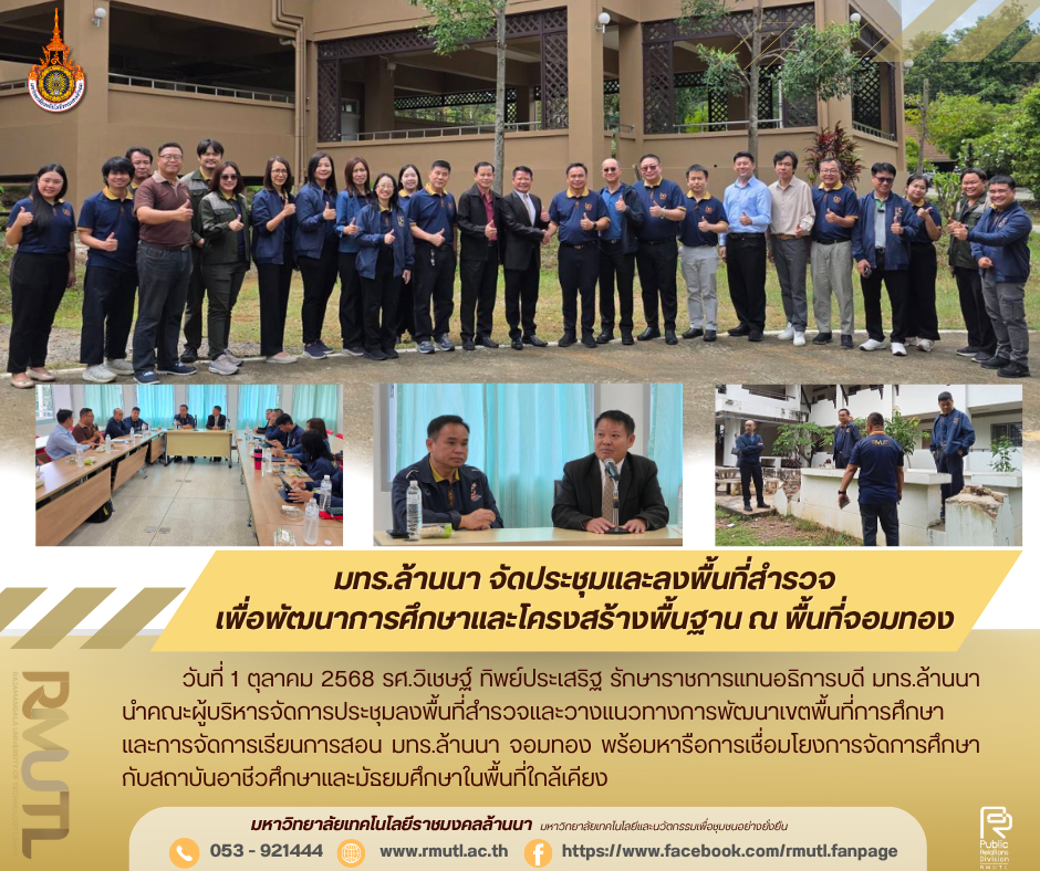 วันที่ 1 ตุลาคม 2568 มหาวิทยาลัยเทคโนโลยีราชมงคลล้านนา จัดการประชุมและลงพื้นที่สำรวจแนวทางการพัฒนาเขตพื้นที่การศึกษาและการจัดการเรียนการสอน โดยมี รองศาสตราจารย์วิเชษฐ์ ทิพย์ประเสริษฐ์ รักษาราชการแทนอธิการบดี มทร.ล้านนา เป็นประธานการประชุม พร้อมด้วยคณะผู้บริหารมหาวิทยาลัย และได้รับเกียรติจากนายชัชวาลย์ มูลศรี ผู้อำนวยการวิทยาลัยการอาชีพจอมทอง เข้าร่วมการประชุม ณ ห้องประชุมพญาชมพู อาคารจอมทอง 3 มทร.ล้านนา พื้นที่จอมทอง อ.จอมทอง จ.เชียงใหม่ เพื่อรวมกันกำหนดทิศทางการจัดการเรียนการสอนและการพัฒนาหลักสูตรให้สอดคล้องกับความต้องการของชุมชนและบริบทของพื้นที่ รวมทั้งสร้างความเชื่อมโยงการศึกษากับสถาบันต่างๆในระดับอาชีวศึกษาและมัธยมศึกษา อาทิ วิทยาลัยการอาชีพจอมทอง วิทยาลัยการอาชีพบ้านโฮ่ง และโรงเรียนแม่แจ่มวิทยาคม