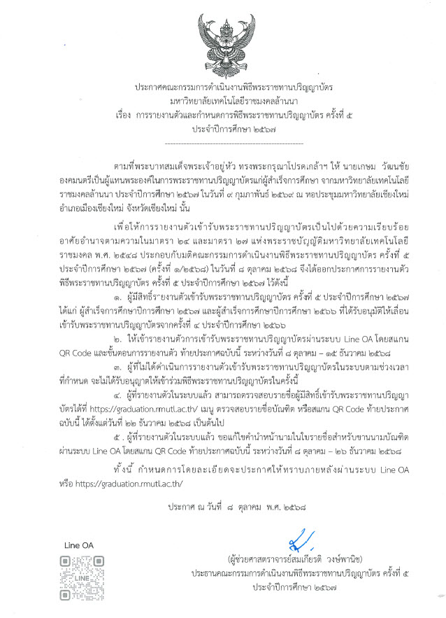 มหาวิทยาลัยเทคโนโลยีราชมงคลล้านนาขอแจ้ง กำหนดจัดพิธีพระราชทานปริญญาบัตร ครั้งที่ 5 ประจำปีการศึกษา 2567
