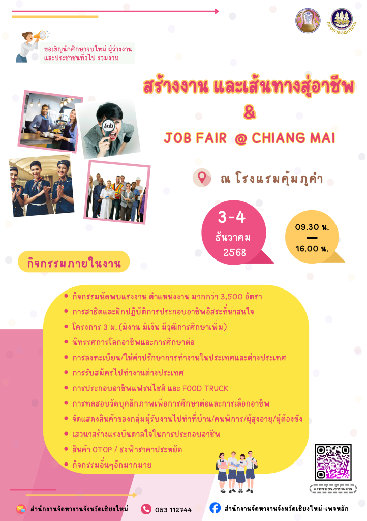 ขอเชิญนักศึกษาใหม่ ผู้ว่างงาน และประชาชนทั่วไป ร่วมงาน "สร้างงาน และเส้นทางสู่อาชีพ" & JOB FAIR @CHIANG MAI