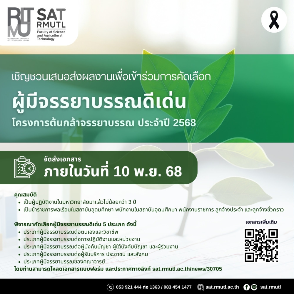 โดยท่านสามารถโหลดเอกสารแบบฟอร์ม และประกาศทางลิงก์ sat.rmutl.ac.th/news/30705 หรือคิวอาร์โค้ดแนบมาท้ายนี้ หากมีข้อสงสัยกรุณาติดต่อผู้ประสานงาน นายนคร คำกิติ (เจ้าหน้าที่บริหารงานทั่วไป) เบอร์โทร ๐๕๓ ๙๒๑ ๔๔๔ ต่อ ๑๓๖๓ หรือ ๐๘๓ ๔๕๔ ๑๔๗๗